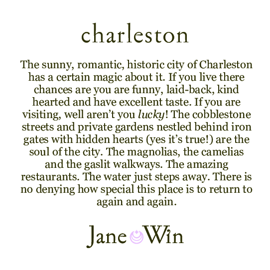 The sunny, romantic, historic city of Charleston has a certain magic about it. If you live there chances are you are funny, laid-back, kind hearted and have excellent taste. If you are visiting, well aren't you lucky! The cobblestone streets and private gardens nestled behind iron gates with hidden hearts (yes it's true!) are the soul of the city. The magnolias, the camellias and the gas-lit walkways. The amazing restaurants. The water just steps away. There is no denying how special this place is to return to again and again.