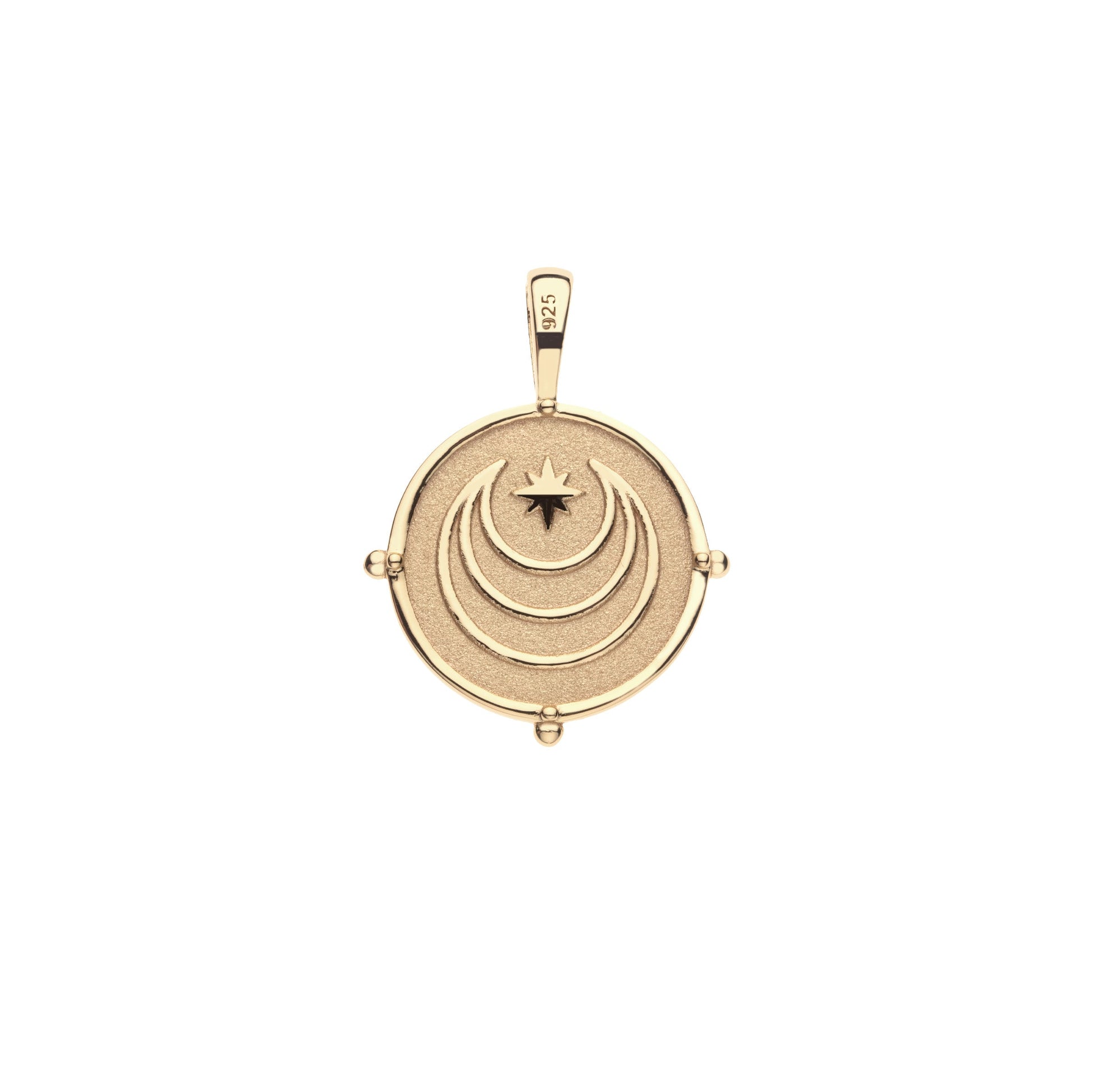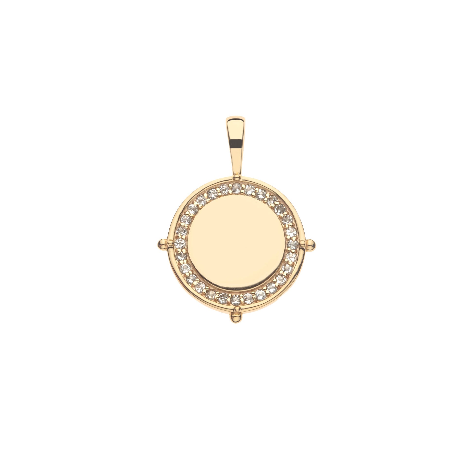 For the lover of the classic monogram paired with our signature double sided coin, this pendant has a high shine front side, ready for engraving, surrounded by a ring of sparkling white topaz stones. Flip it over to wear the crescent moon and star design.
