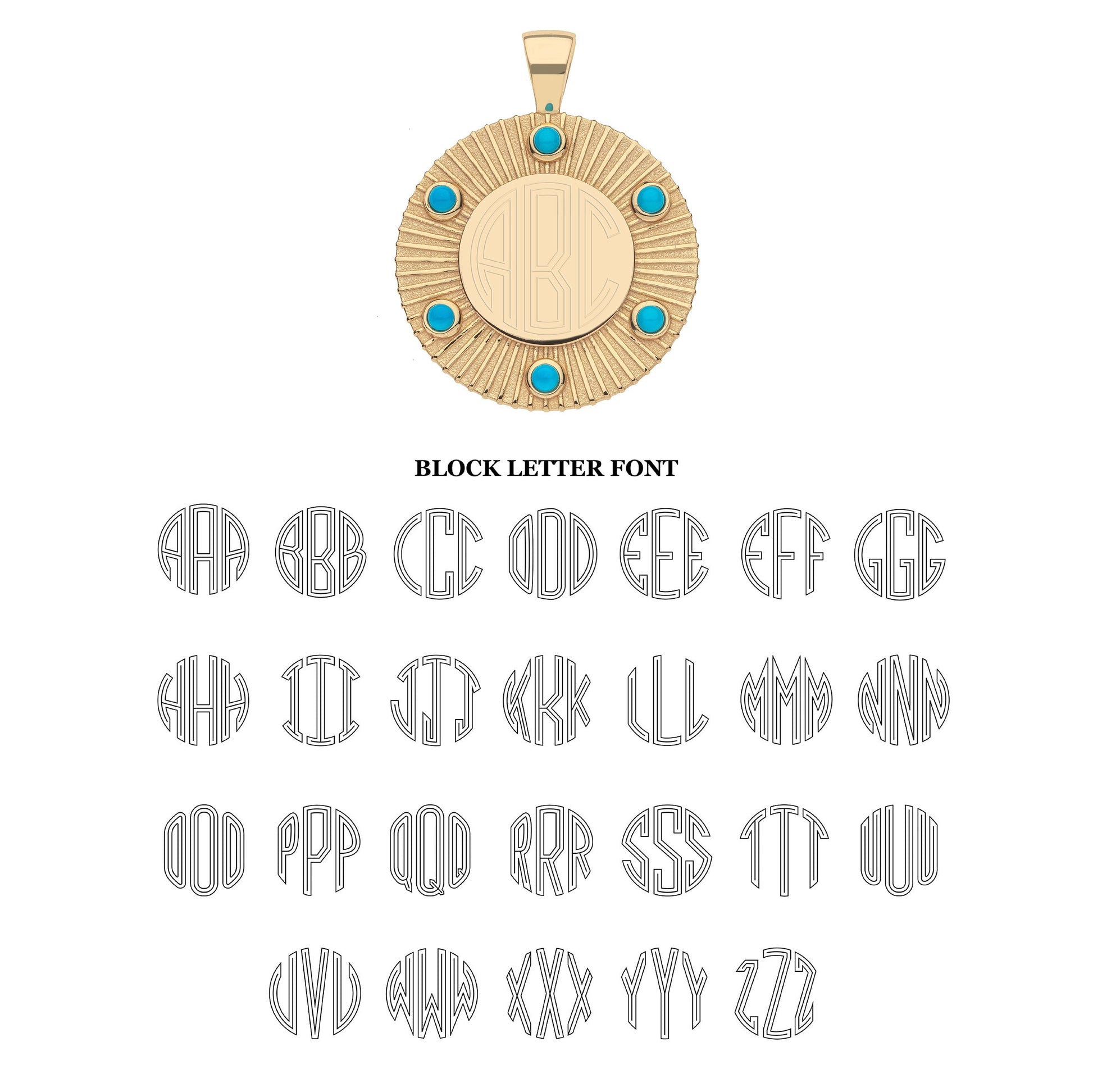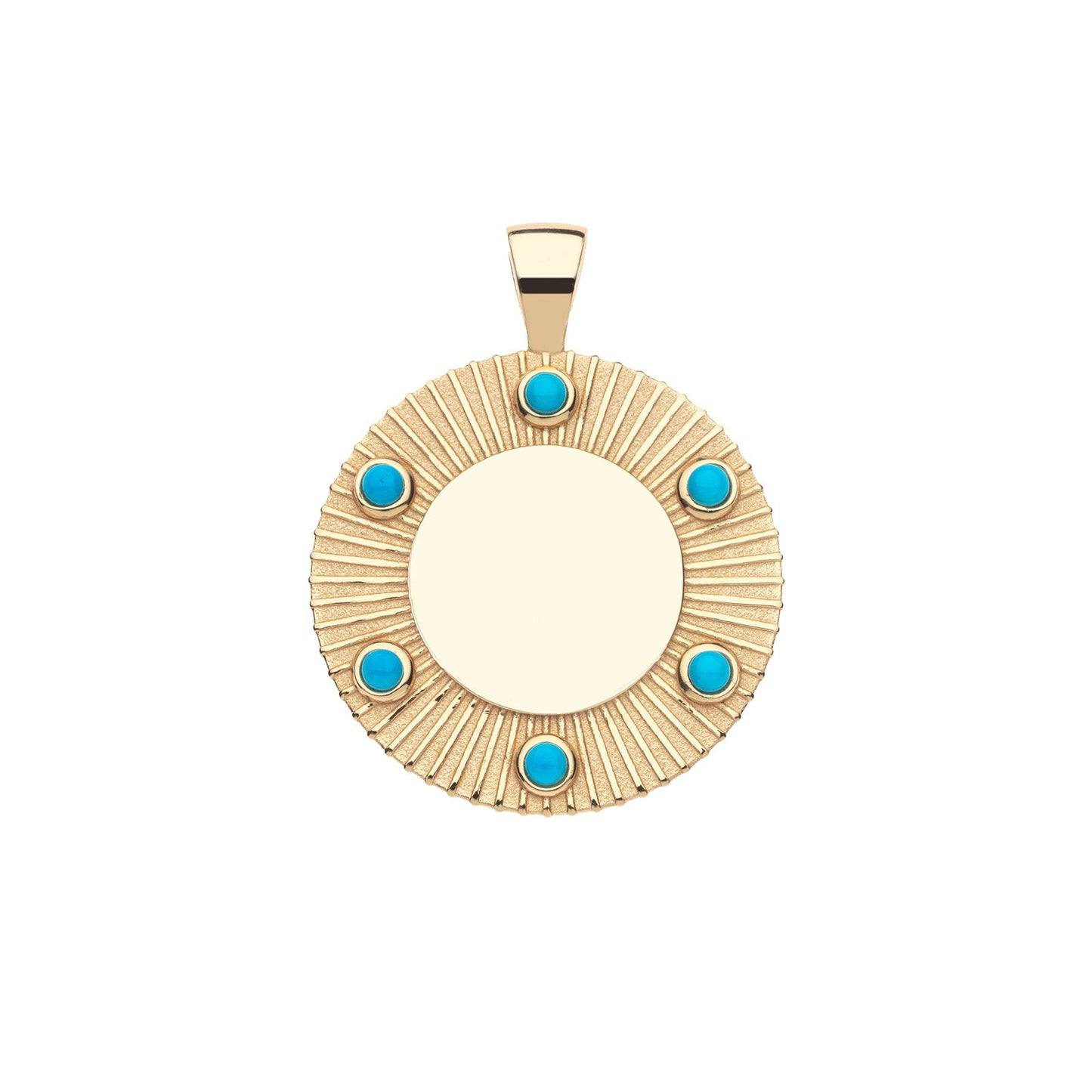 Life is a cycle of constant motion, ever turning like the Earth around the sun. Inspired by the planets circling the sun, the turquoise stones on this pendant revolve around an engravable center. Engrave it with your initials or those of someone you love, and let the stones be reminders of those who surround you on your journey.