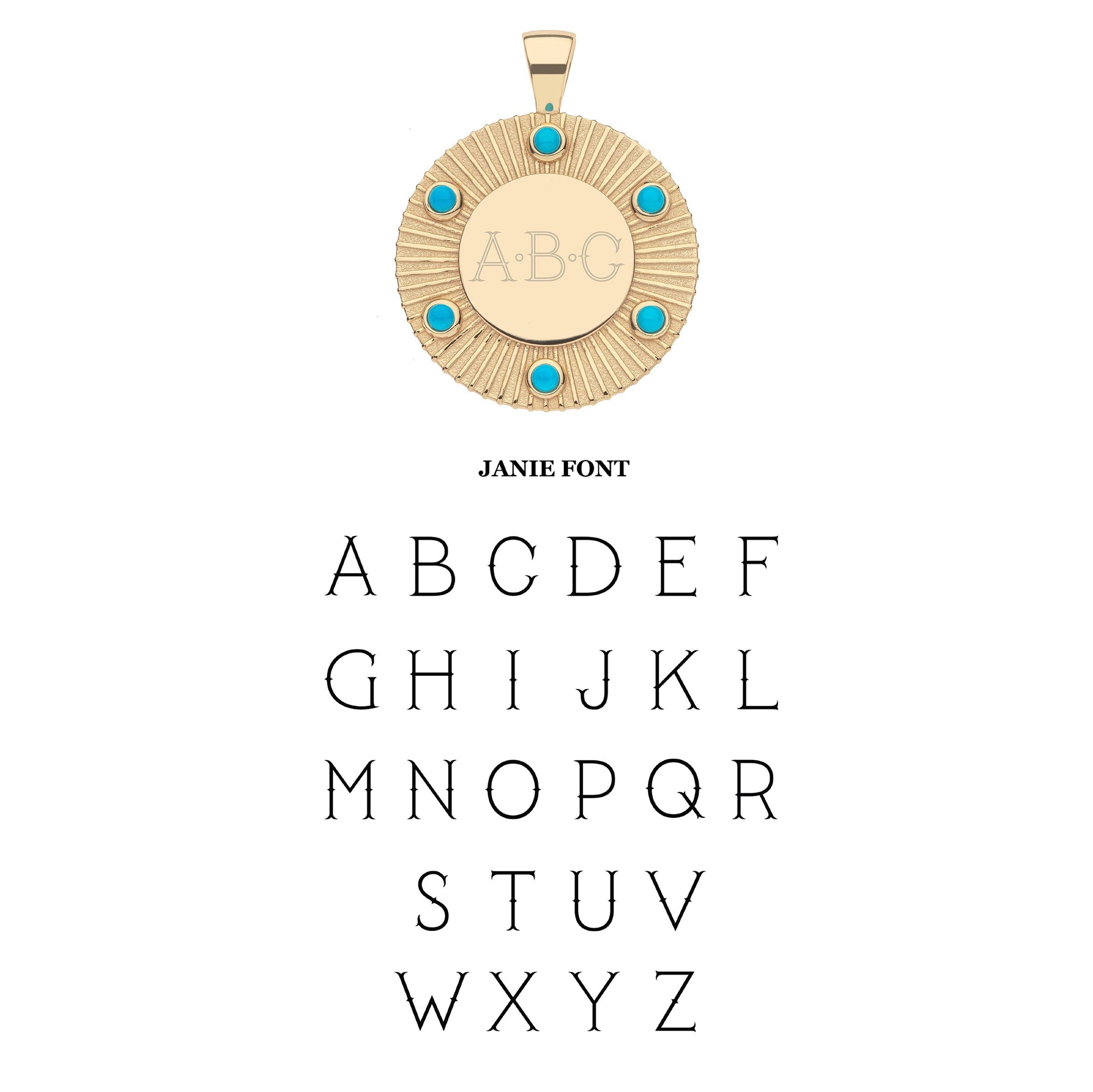 - For Janie font, we recommend you use the order of your initials: First, Middle, Last (e.g. ABC). For these fonts, there will be a dot between each letter unless otherwise specified in the order notes.