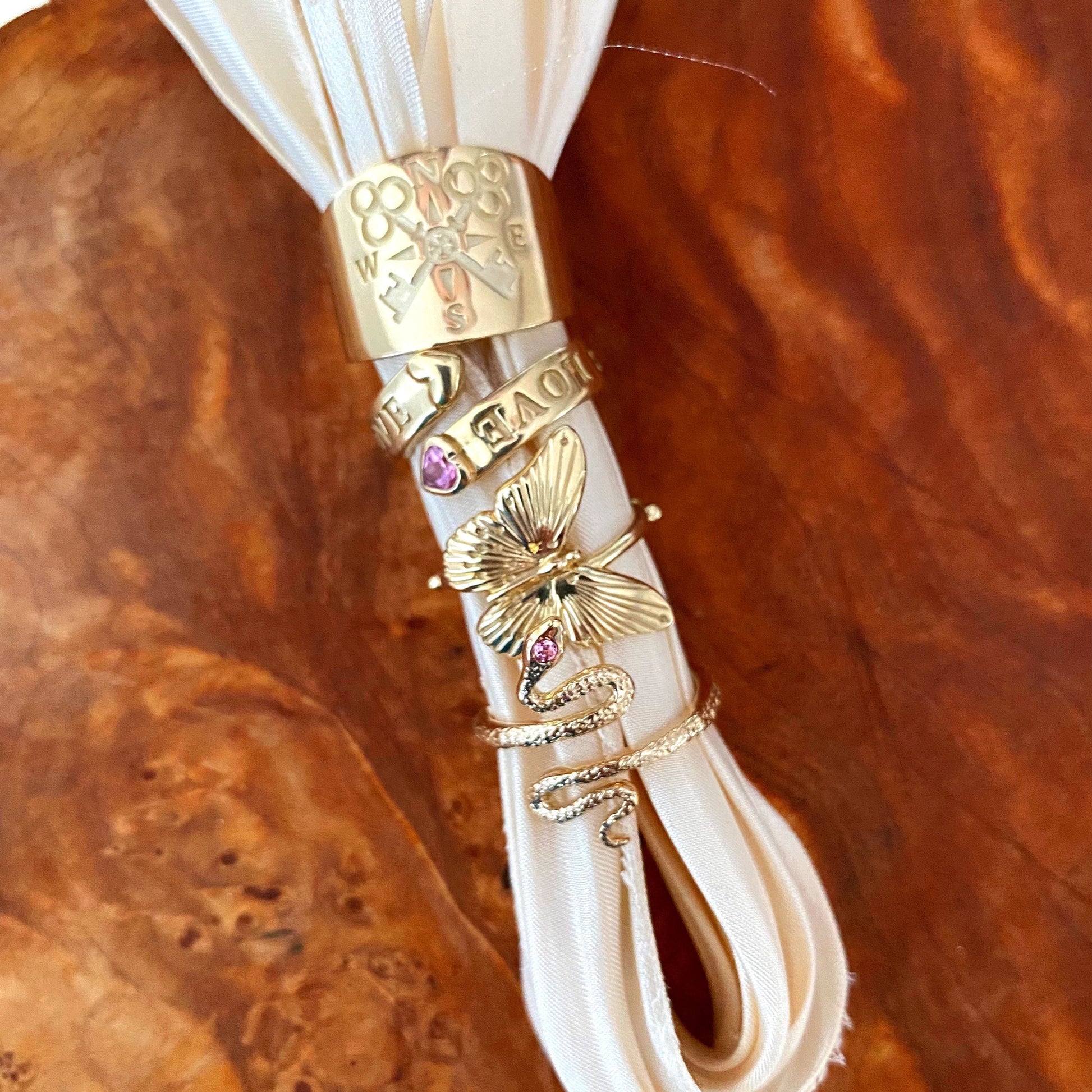 We transformed our Freedom Butterfly into a twisted-band ring with seven lucky dots along the band - only you know the secret of having the word "free" held close to you on the inside.