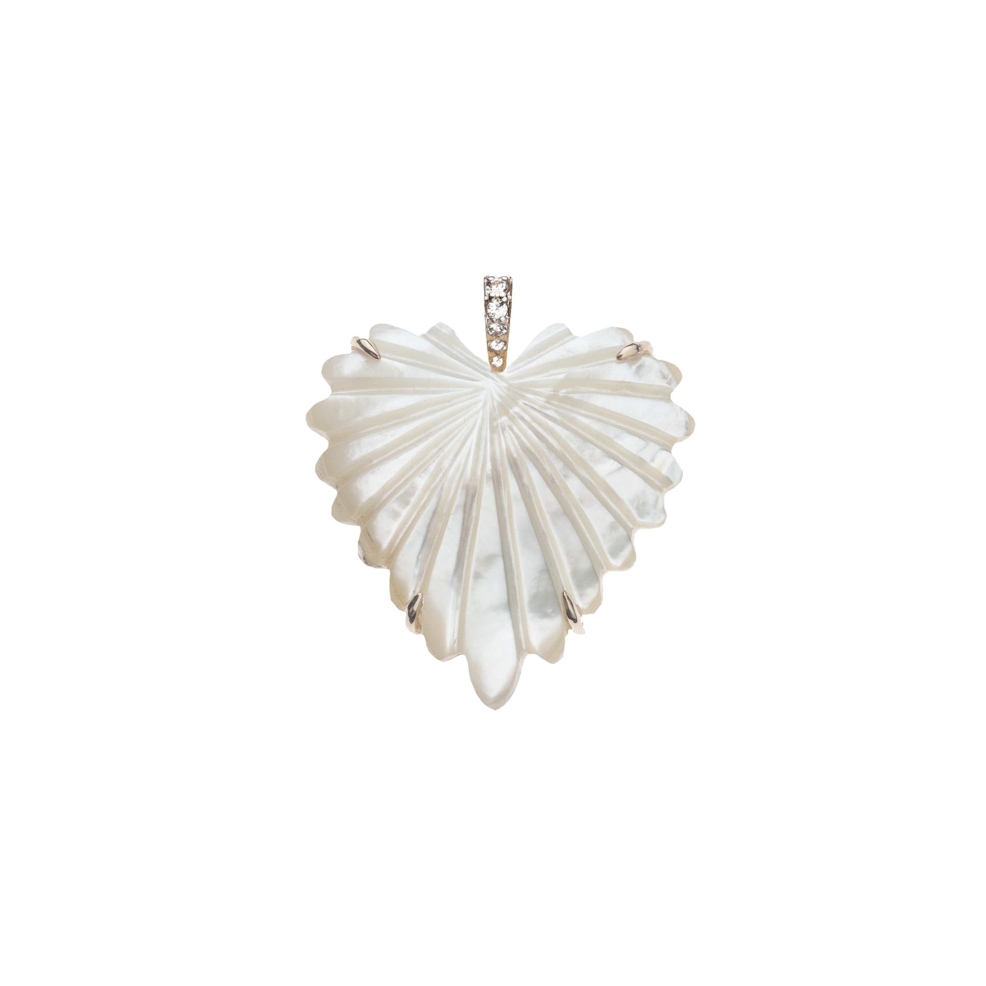 WE ARE OBSESSED. Obsessed with love. Obsessed with hearts. And obsessed with this heart. A new version of our most popular pendant - the Full Heart - is a hand carved palm leaf heart design made out of mother of pearl, set into 10k gold, and accented with white topaz stones. This pendant makes a statement. We can't stop buying hearts for ourselves - but this pendant also makes a spectacular gift. Show your love!