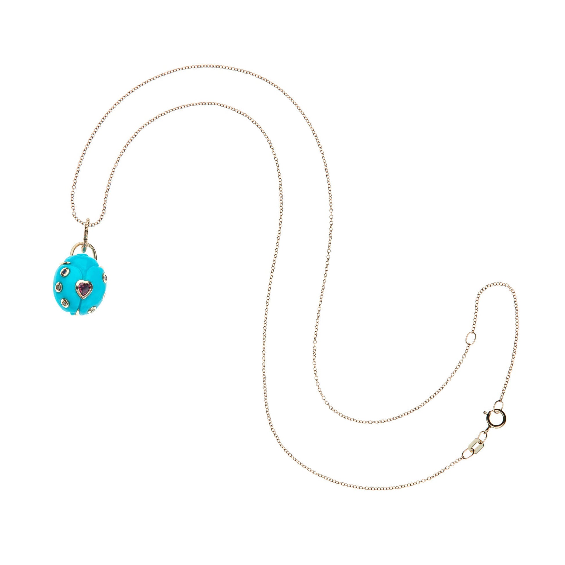 Ladybugs and rainbows, two of the most loved lucky signs, and this pendant has them both. This ladybug is hand carved from stabilized turquoise and adorned with a pink tourmaline heart and a rainbow of gemstones. Set into 10k gold, you can hold this lucky charm close to your heart for years to come.