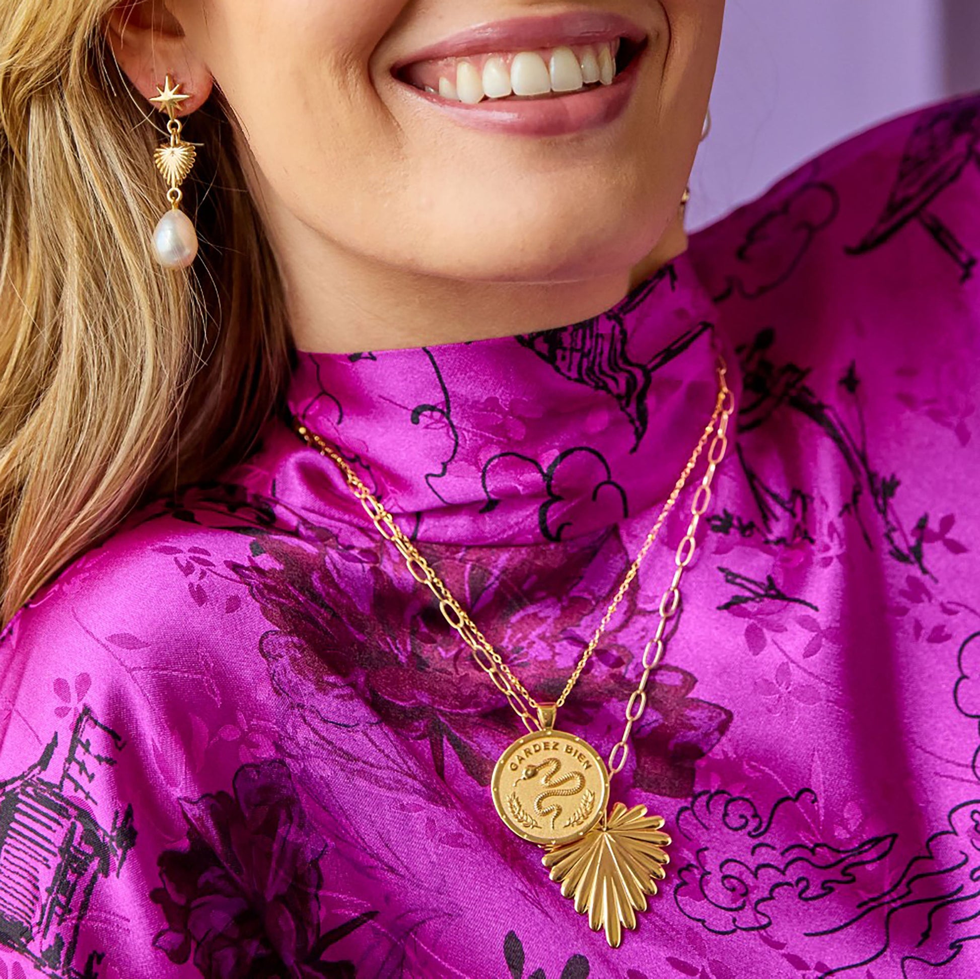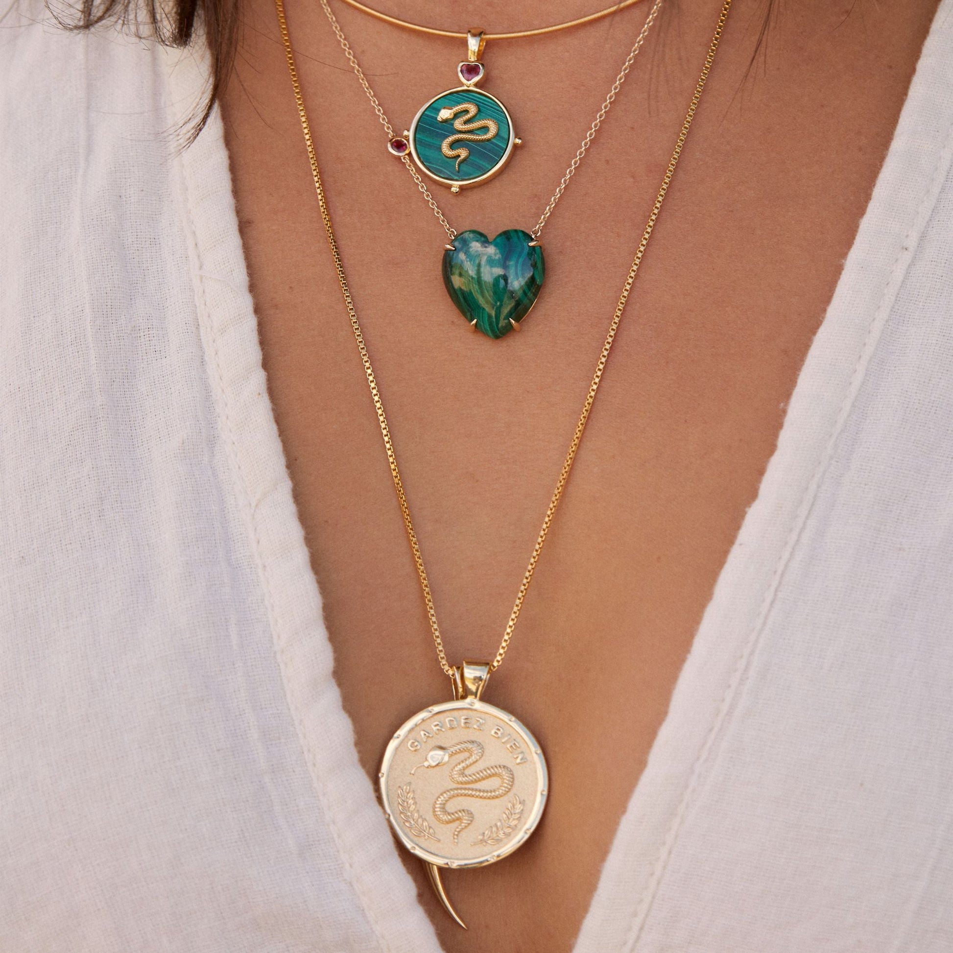 Keep safe. The snake in this pendant symbolizes wisdom, power and healing. Gardez Bien inscribed over the snake is French for Guard Well. This pendant is a reminder of your own strength and the positive ways you protect yourself and those you love.